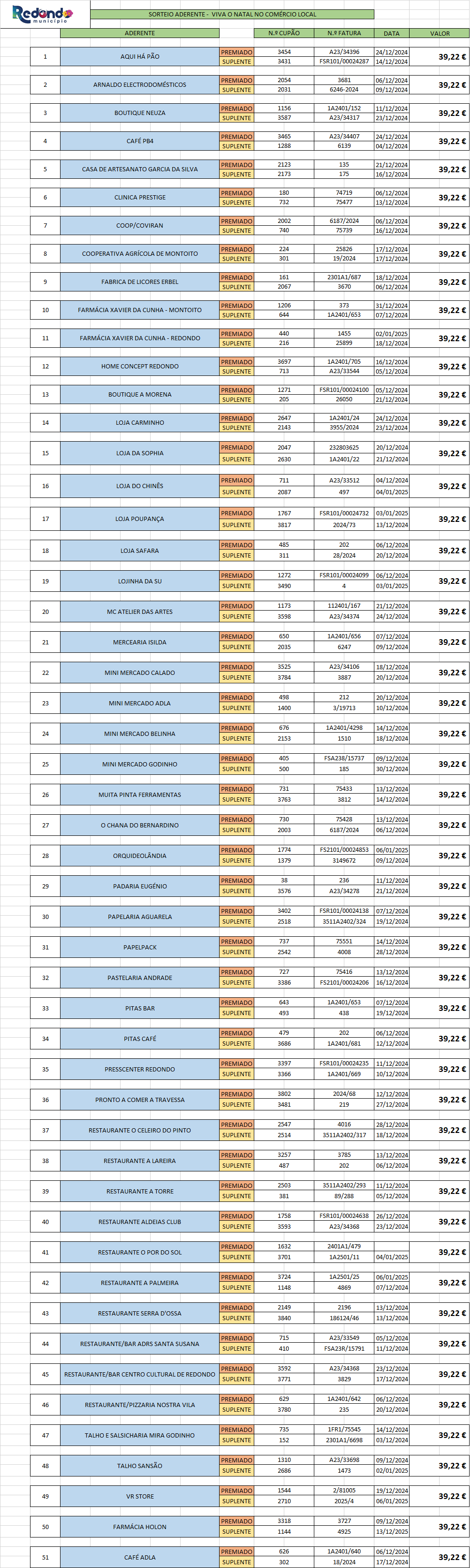 No segundo sorteio – “Viva o Natal no Comércio Local – Aderente” – (51 prémios, materializados em vales únicos no valor de 39,22 euros), é atribuído um vale em cada aderente a ser utilizado, unicamente, no mesmo pelo premiado sorteado.